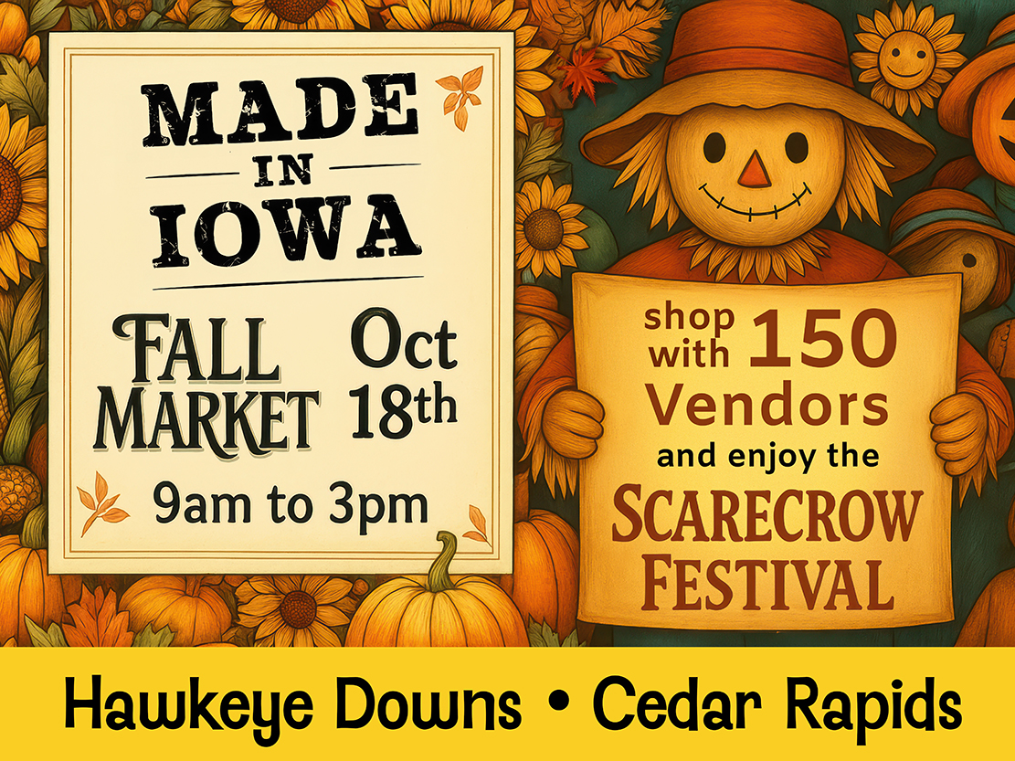 Made in Iowa Fall Market & Scarecrow Festival brings together Scarecrow Festival with 50+ scarecrows with 150+ Iowa makers, bakers, and artists, live music, a community food drive supporting Together We Achieve. It’s like the Festival of Trees, but for scarecrows. Supported by scarecrows and humans across Iowa, including Scarecrows Against Hunger. Logos attached.